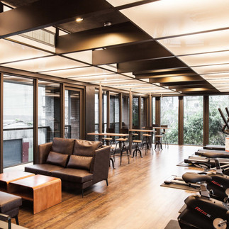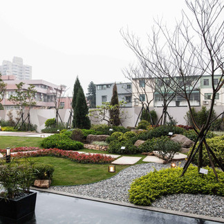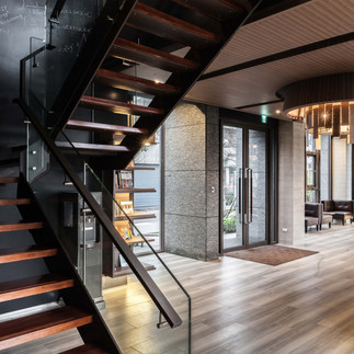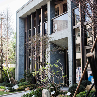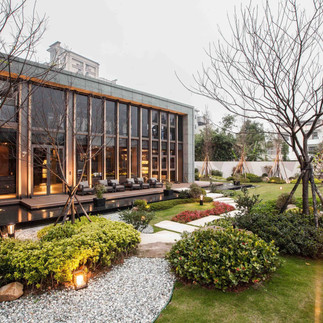 呼應基地環境內廣闊的庭園景致,二層樓高的獨立會館,以三向度落地窗的現代風格立面,營造內外交融的視覺感受,由H型鋼建構的窗櫺內,巧妙地置入粗曠、原始質地的木料,藉以暖化玻璃與金屬冰冷、生硬的質感。踏入會館內,一樓由交誼與接待空間組成,穿透的牆面讓庭院扶疏的綠樹植栽成為最好的背景構圖。灰色調的混凝土柱面,輔以木質的造型天花、搭配鐵件的特製燈飾、懸吊工法構築的收納壁櫃,創造工業風氛圍中蘊藏的細緻設計質感,構構出獨特的空間情境。