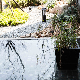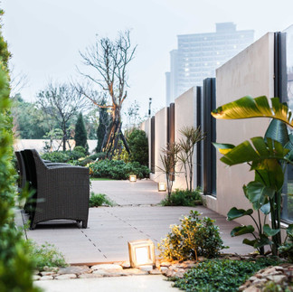 偌大的庭園內,帶狀無邊際水池橫亙其中,為社區的戶外場域注入一股流動的清新感。透過大量的灌木與喬木植栽、散置的桌椅,營造放鬆、休閒的居家氛圍。庭園後側與流經小溪相接的區塊,設計師特別以穿透的玻璃牆面弱化現實地域分界的區隔,讓內與外之間保有其聯繫,外部的生態、視覺景觀亦能坐擁入懷。