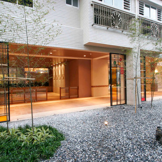 頂蓋式的開放迴廊,掌握在介面的設計,甚為關鍵,就如同廣場的設計優劣在於邊緣一般,後院以宜蘭清碎石滿鋪為主,點綴種植孟宗竹與埋設水霧,讓座椅旁的對談多了水的智慧與植物的呼吸聲.............