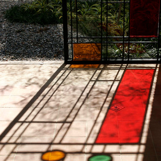 這是多年前的一個建案中庭,有頂蓋式的開放空間作為串連中庭與後院的銜接,這裡利用康丁斯基的幾何圖騰以鐵件加以變化,加上彩色玻璃作為屏風,在迴廊與後院的介面創造有趣的表情。是屏風但卻沒有遮擋任何事物,倒像是為增添色彩與線條的立體畫作,在陽光的反射下,成為有趣的倒影,高彩度的原色有種神奇的魔力,讓人振奮讓人喜悅,如果說色彩有能量的話,那這就是本案讓人感到印象深刻之處。