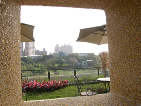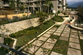 大尺度的景觀庭園,避免一眼看盡,我們的習慣是用景觀造型牆,來做視覺與空間的阻隔,加上轉折與開口,讓牆的前後有不同迥異的空間情境。基地後方面溪,有山景,利用高低差現況,室內的spa池,鏡設池串連,作為無邊際水池的效果,創作出一個休憩寧靜觀景的區域。